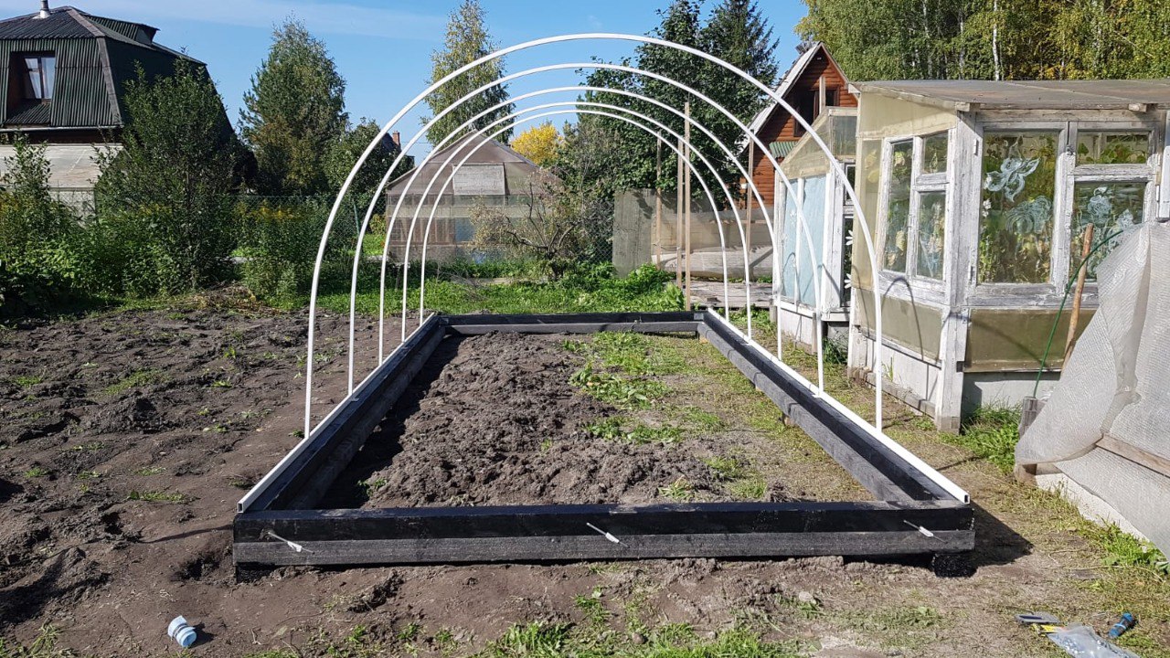 Дуги каркаса с шагом 0,67 метр. Две двери, две форточки.